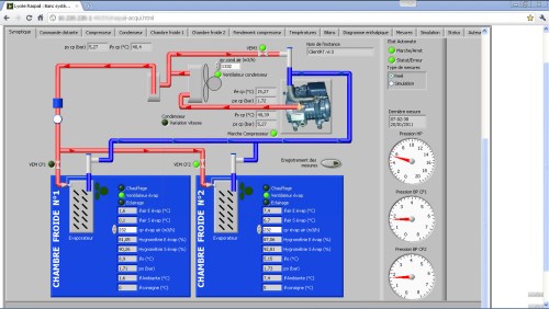 Este sistema permite el estudio de los sistemas frigoríficos y probar en la practica los cálculos termodinámicos aplicados a la refrigeración. La particularidad es que se puede manejar desde Internet con un navegador como Internet Explorer, Firefox o Chrome. Consiste en dos cuartos fríos con evaporador individual pero con un circuito compartido de fluido refrigerante tipo R134a (compresor, condensador…). El control y la configuración del sistema se hace de dos maneras: El Compact Fielpoint agrega la función de control remoto por Internet, la visualización de las curvas de temperatura del aire, del fluido refrigerante y su presión, las potencias y… Lee más: LabVIEW tiempo real: sistema frigorífico a dos niveles de temperatura - LabVIEW: Maleta de meteorología portátil